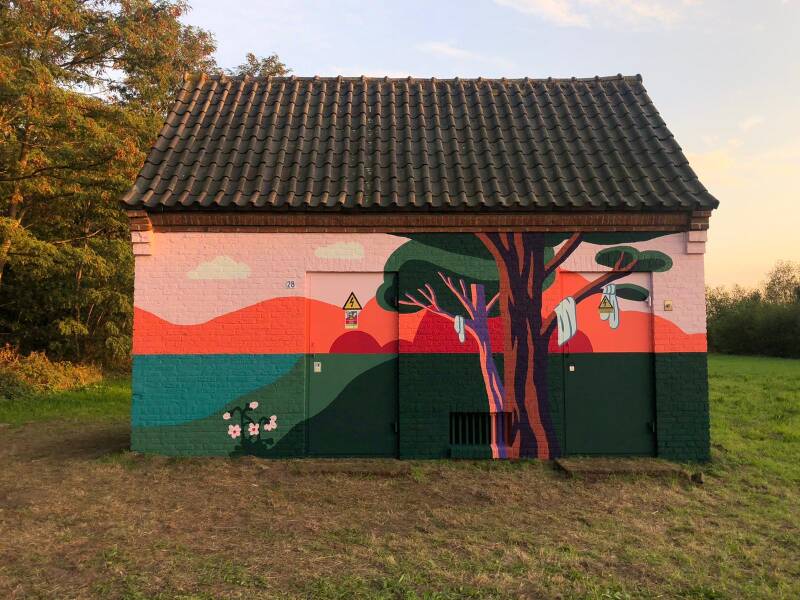 Voor Blind Walls Gallery Breda was mijn collega Heavenleigh Jeroense gevraagd om een muurschildering te ontwerpen én te schilderen op een elektriciteit huisje. Samen met een klein team hielpen we haar de muurschildering tot leven te brengen.